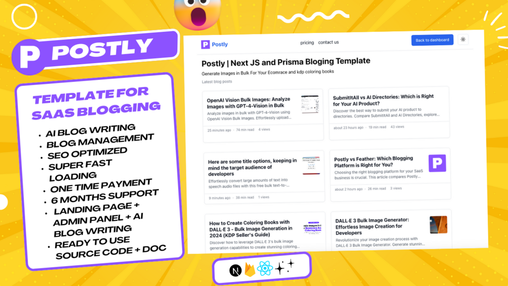 Live demoPostly is a simple and easy blogging solution for those who are busy in many startups like me so you will be needed a good traffic for your website but without blogging its not possible so i have created this template which you can host on your own vercel or vps for free and it use Firebase as backend, its one solution for writing blog, managing blogs